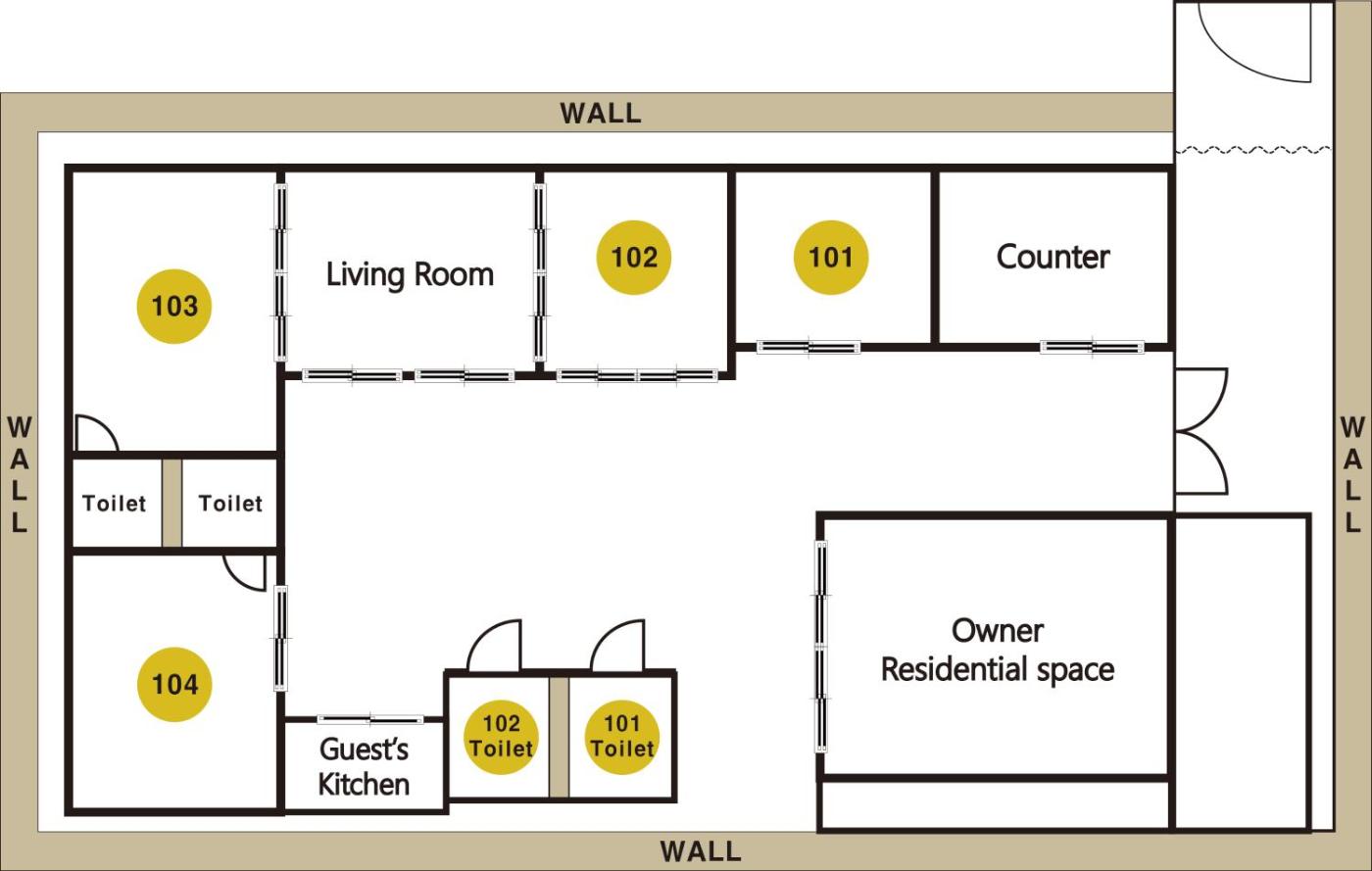 Korean-style Double Room 103 - Private Bathroom located in Room. This room shares living-room and entrance connecting with the garden with Korean-style Double Room 102 - Private Bathroom located in Garden ;