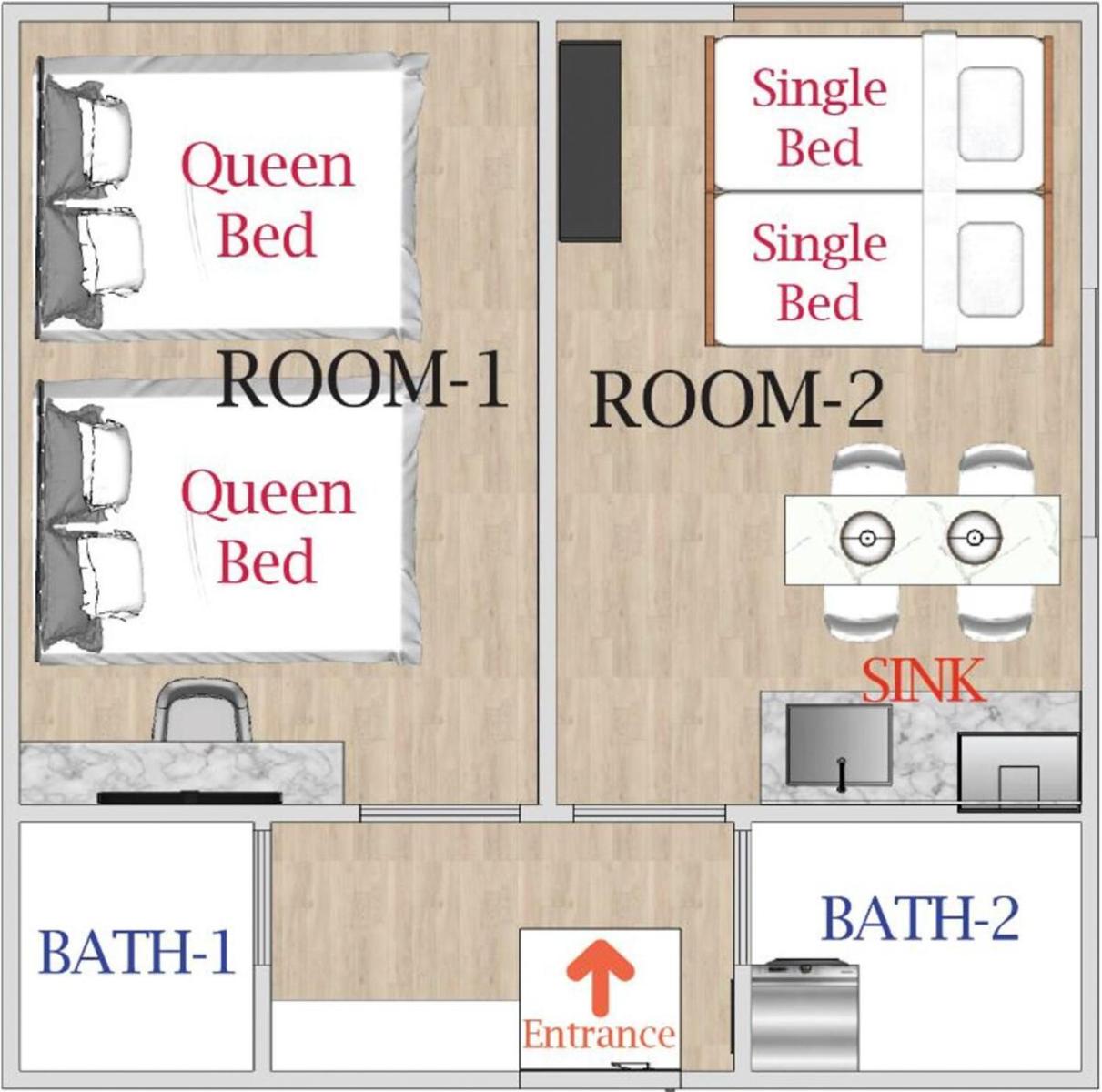 Family Room. This family room has a private bathroom and air conditioning. The family rooms kitchen is available for cooking and storing food. The unit has 4 beds. ;